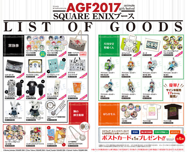 さらに「京都国際マンガ・アニメフェア(京まふ)2017」でも販売された椿いづみ「月刊少女野崎くん」のグッズや、ヨシノサツキ「ばらかもん」の商品も登場する。なおスクウェア・エニックスブースにて2000円以上購入した人には、「黒執事」「鋼の錬金術師」「月刊少女野崎くん」「ばらかもん」のポストカードが1枚プレゼントされる。