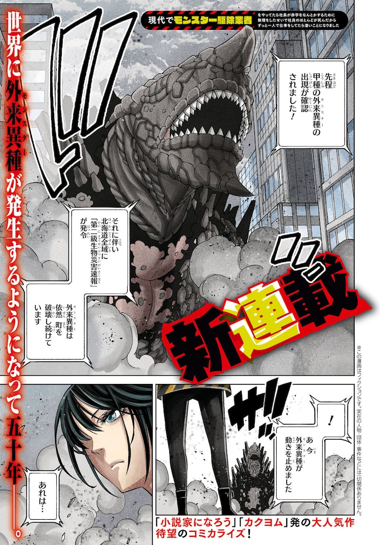 同作は、外来異種(モンスター)が発生するようになってから50年が経過した世界で、フリーランスの駆除業者をやっている青年・荒野歩の物語。テレビでは巨獣に立ち向かう駆除業者の活躍が報じられているが、それを眺める同業者・歩は「そんなのTVの中だけの話だよ」とツッコミを入れ、区役所からの依頼で地味な仕事をこなす日々を送っている。報酬がいい仕事もできる上のランクの免許を取るか、会社に所属することを勧められても「自分の命にしか責任を持たない今が一番」と拒否する歩には、忘れがたい過去があった。