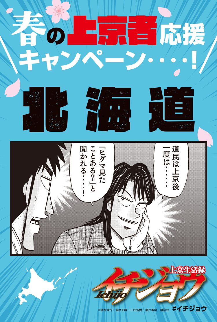 モーニング(講談社)で連載中の「上京生活録イチジョウ」は、パチンコ台“沼”の創造主として登場した帝愛裏カジノ店長・一条聖也を主人公とした物語。「春の上京者応援キャンペーン」では単行本1~4巻を購入した人を対象に、47種のイラストカードを配布する。イラストカードには47都道府県からの上京者に向けた、イチジョウの一言アドバイスが記されている。配布店舗は公式Twitter(@ichijo_morning)で確認を。