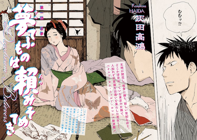 「スインギンドラゴンタイガーブギ」の灰田が描く同作は、明治時代の東京を舞台に絵師たちの恋を描く物語。明治34年の東京で、駆け出しの浮世絵画家・池田は、師匠のもとで研鑽を重ねる日々を送っていた。特に女性を描くことが大好きな池田は、ある日夢の中に出てきた理想の女性にそっくりな少女と出会い……。初回は巻頭カラーで掲載された。
