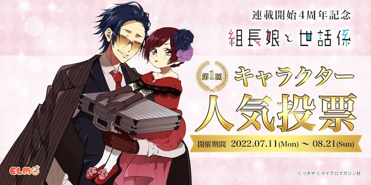 つきや組長娘と世話係」の連載4周年を記念したキャラクター人気投票が、本日7月11日にスタート。8月21日まで投票を受け付けている。