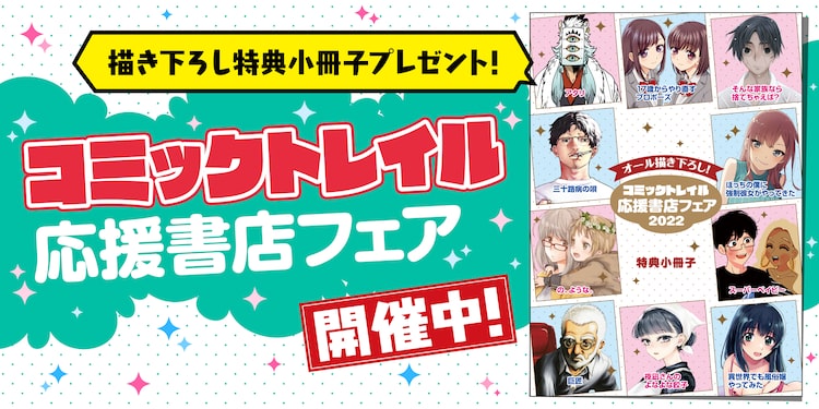 「コミックトレイル応援書店フェア」の対象作品は、麻生海「の、ような。」、丸顔めめ「スーパーベイビー」、栗ののか「ぼっちの僕に強制彼女がやってきた」、河上だいしろう「三十路病の唄」、Gたかし原案協力による高橋一仁「巨匠」、板場広志「17歳からやり直すプロポーズ」、村山渉「そんな家族なら捨てちゃえば?」、琥狗ハヤテ「アタリ」、パラダイス山元監修による勘米良優助「夜凪さんのよなよな餃子」、森尾正博「異世界でも風俗嬢やってみた」。前述の10作品から1冊を購入するごとに「オール描き下ろし特典小冊子」1冊がプレゼントされる。冊子には対象作品のマンガやイラストを収録。開催店の一部ではサイン入り複製原画、ポスター、手書き風ミニポップなどの展示が行われる。詳細は公式の告知で確認を。