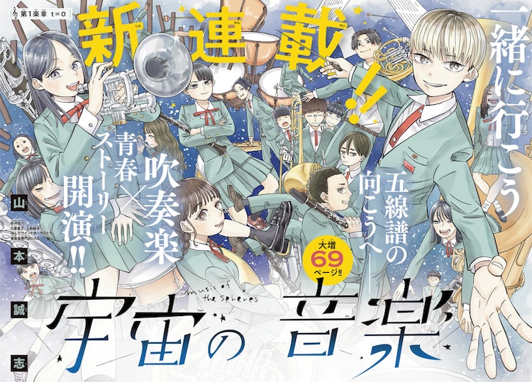 「宇宙の音楽」は、プロのトランペット奏者を父に持つ、吹奏楽を愛する少年・宇宙零(たかおきれい)を描く吹奏楽青春ストーリー。ぜん息を患っている零はトランペット奏者になる夢を諦め、吹奏楽部のない高校に進学する。そこで出会ったのは、創部したての吹奏楽部と、自由なトランペット吹き星野水音。彼女に“吹奏楽好き”を見抜かれた零は、入部を誘われるが……。初回はセンターカラー69ページで掲載された。