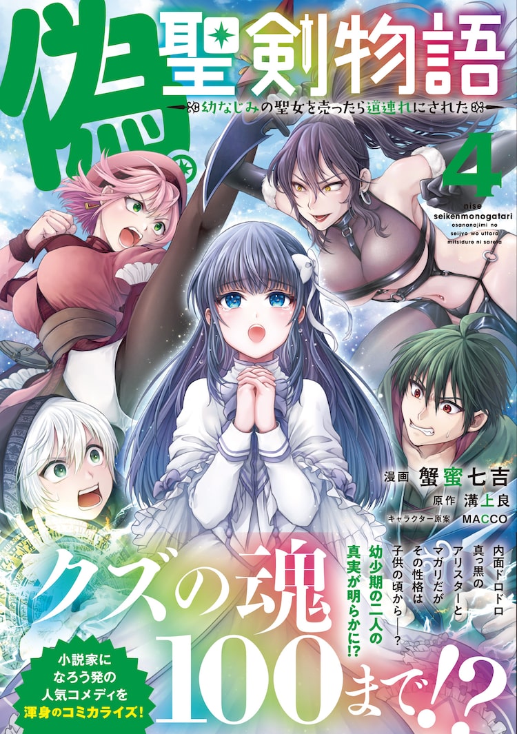 「偽・聖剣物語 幼なじみの聖女を売ったら道連れにされた」は、善人のふりをして本性はクズという村の青年・アリスターが聖剣の持ち主に、彼と並ぶほどクズな幼なじみの村娘・マガリが聖女に選ばれたことから始まる異色ファンタジー。4巻では、頭を打ったショックでマガリの最近の記憶が飛んでしまい、素直で純粋だった子供時代の性格が表出する。そんなマガリにアリスターが苦手意識を感じる様子や、マガリが今の性格になってしまった過去を描く。