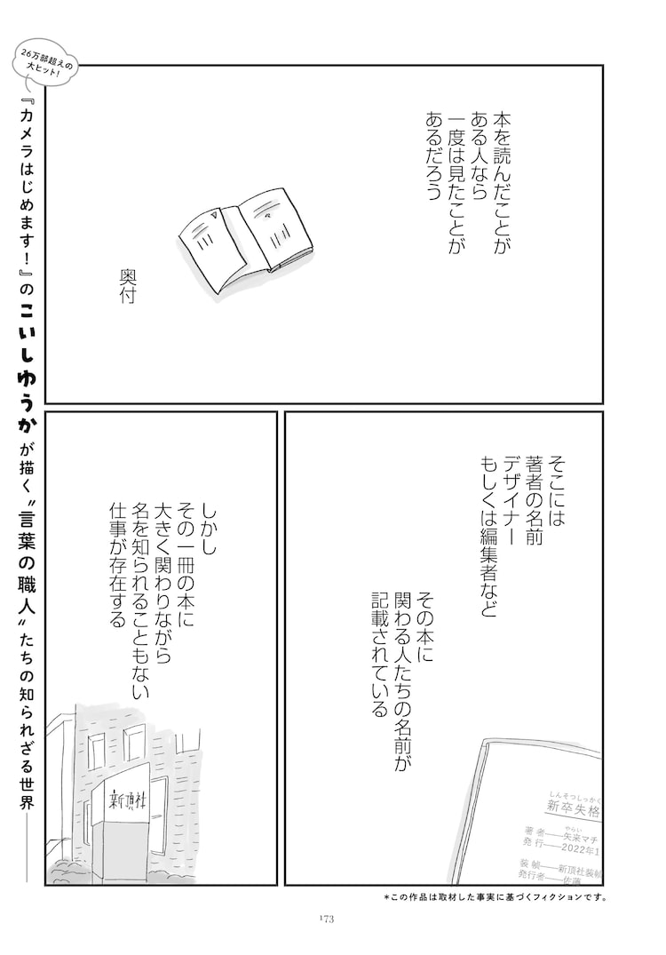 新潮社校閲部の全面協力のもと、校閲という仕事の実態が事細かに描かれる同作。主人公・九重心は新頂社校閲部文芸班に所属し、社歴10年になる。第1話で九重は、新人社員が給湯室の隅で泣いているところを見かける。どうやら彼女は、素読みのやり方に対して先輩社員からダメ出しされたようで……。キャンプを題材とした作品を多く手がける作者の新境地に注目だ。