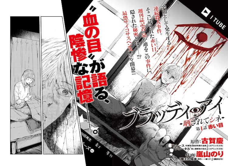 古賀慶原作による嵐山のりの新連載「ブラッディ・アイ-晒されてシネ-」が、本日11月8日に日本文芸社のマンガアプリ・マンガTOPでスタートした。