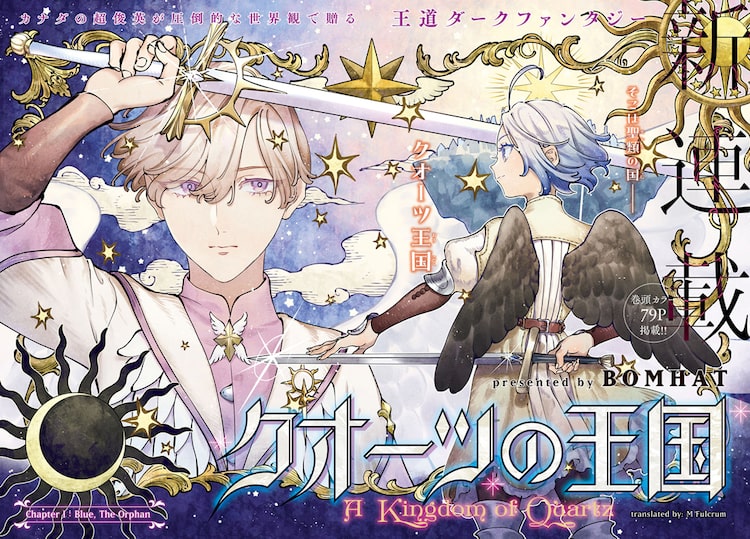 カナダ出身の俊英・BOMHATが描く「クオーツの王国」は、黒い翼を持って生まれた孤児の少女ブルーを描くダークファンタジー。“天使”、それは女神の意思に従い、クオーツ王国を悪魔から守る英雄のような存在だ。生まれつき黒い翼を持つブルーは、周りの子供たちにからかわれるのを気に病みながらも、信頼するシスター・ベスに見守られながら平和な毎日を送っている。いつかは自分もクオーツ王国を守る天使になる、そう夢見ていたブルー。そんなある日、ブルーは天使の中でも最強の戦士である大天使と、彼らを統べる皇太子のカシアン王子と出会う。その出会いをきっかけに、ブルーの運命は動き出す。