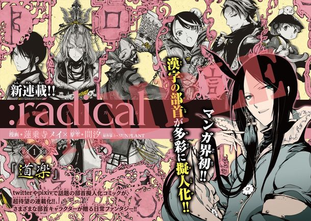 「:radical」はしんにょう、きへんといった漢字の部首を擬人化した“部首キャラクター”たちの日常ファンタジー。今号では一挙2話が掲載され、それぞれしんにょうときへん、きへんとてへんによる物語が展開された。「神様の子守はじめました。」は霜月による同名小説のコミカライズ。就活中だった22歳男子・羽鳥梓が神の国で暮らすアマテラスにスカウトされ、青龍、白虎、朱雀、玄武という四神の子育てを引き受けたことから物語が動き出す。「偉人ですか? 英雄ですか? 死んでもらっていいですか?」は、人材不足に悩むあの世を舞台に描かれるコメディ作品。下級悪魔クーロと天使サイロのコンビが、有能人材スカウトのため下界を奔走する。第1話では2人が織田信長をスカウトしようとして……。