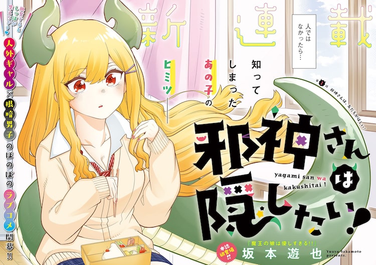 「邪神さんは隠したい!」は根暗な男子高校生・八朔と、彼と同学年の人気者・邪神(やがみ)によるほのぼのラブコメ。表情や挙動が周囲に怖がられてしまう八朔は、なかなか友達ができず、孤独な高校生活を送っていた。ある日先生に頼まれた物を取りに、八朔は旧校舎を訪れる。そこには、いつもたくさんの人に囲まれている邪神が1人で昼食を食べる姿が。そして彼女には大きな角と尻尾が生えていて……。周囲には決して見せられない正体を持つ邪神と、彼女の秘密を知ってしまった八朔の学園生活が描かれる。今号の巻頭カラーで登場した。