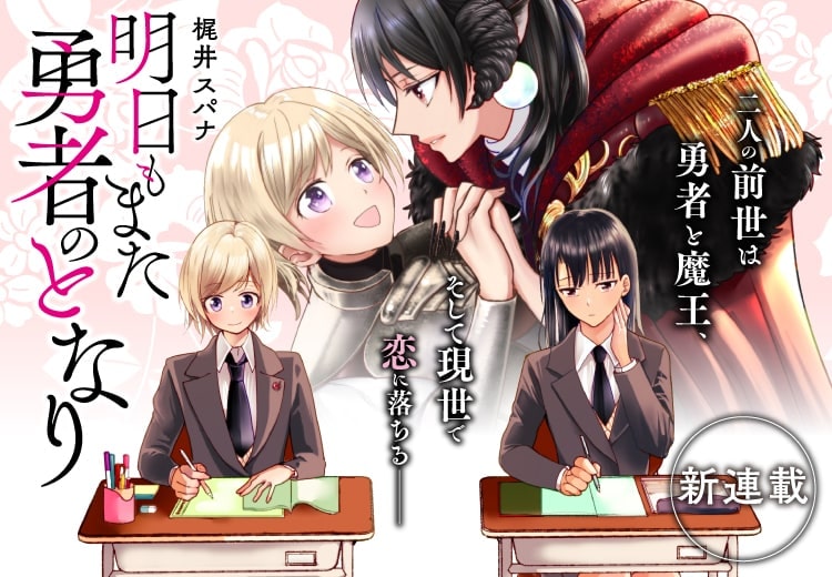 「明日もまた勇者のとなり」は、前世で勇者と魔王だった2人が揃って現世に生まれたことから始まるガールズストーリー。なくなってしまった学校行事のキャンプファイヤーを復活させたい黒瀬真緒は、その目標のため生徒会長として邁進してきた。しかし張り切る黒瀬を快く思わない生徒もおり、嫌がらせを受けているところを助けてくれた百宮奏に、黒瀬は心惹かれてしまう。そんな2人が初めて同じクラスになり、席を隣り合わせたことから物語は動き出す。