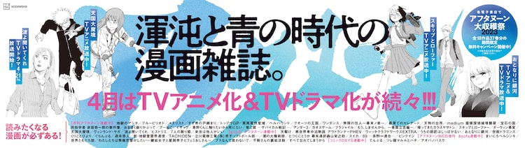 これは月刊アフタヌーンおよびgood!アフタヌーン(ともに講談社)で連載中の4作品が4月よりメディア化されることに合わせて実施されているもの。TVアニメ「天国大魔境」のオープニングテーマを担当するBiSHのメッセージ入りポスターや、アフタヌーンの歴代名作を年表にしたポスター、アフタヌーンの歴代名作ポスターなどを見ることができる。また各電子書店では「アフタヌーン2023大収穫祭」と称し、全18作品37巻分の期間限定無料キャンペーンを実施中だ。広告の掲出は4月16日まで。