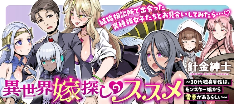 「異世界嫁探しのススメ ~30代独身男性は、モンスター娘から需要があるらしい~」の物語は、周囲の結婚ラッシュに取り残された独身男性が、結婚相談所に向かう途中で異世界転移してしまったことから開始。異種族同士をマッチングさせる異世界ならではの結婚相談所に迷い込んだ主人公は、さまざまな人外女子とお見合いをする様子が描かれる。