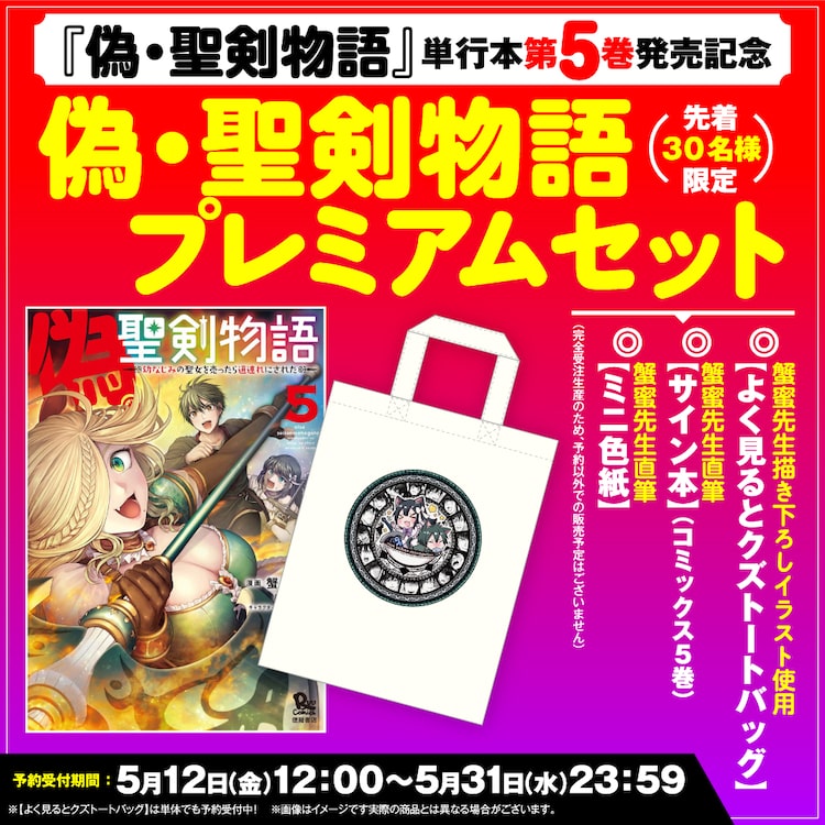 「偽・聖剣物語」5巻、よく見るとクズなトートバッグやサイン色紙付き限定セットも