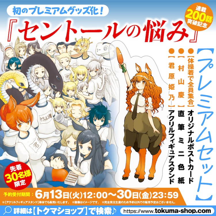 村山慶「セントールの悩み」が連載200話を突破し、これを記念したオリジナルグッズ登場。本日6月13日正午から30日にかけて、徳間書店の通販サイト・トクマショップで受注販売される。