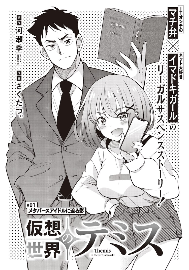 「仮想世界のテミス」は、IT音痴の弁護士とネットに強い今どきの女の子によるコンビを描くリーガルサスペンスストーリー。メタバースアイドルのゴシップに関する依頼を受けた弁護士・一本木正義は、勝手のわからない専門外の案件に手こずる。第1話では、謎の少女が一本木の手助けしたいと名乗りをあげ、2人が依頼達成に向けて協力する様子を描く。