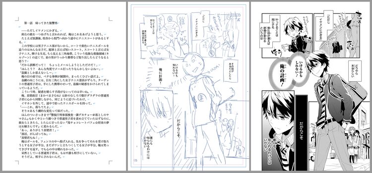 実際に1話の完成原稿を見たときは、前述の通り“絵”が持つ情報量や説得力に圧倒されまして、どうしたら文字書きの小説家としてこれを最大限に活かせるかを考えるきっかけになりました。小説を書くノリで原作を書き込むと、絵で表現できていることまでテキストで補足する形になってしまい、マンガとしては情報過多でくどい。テンポも悪いなどなど……。