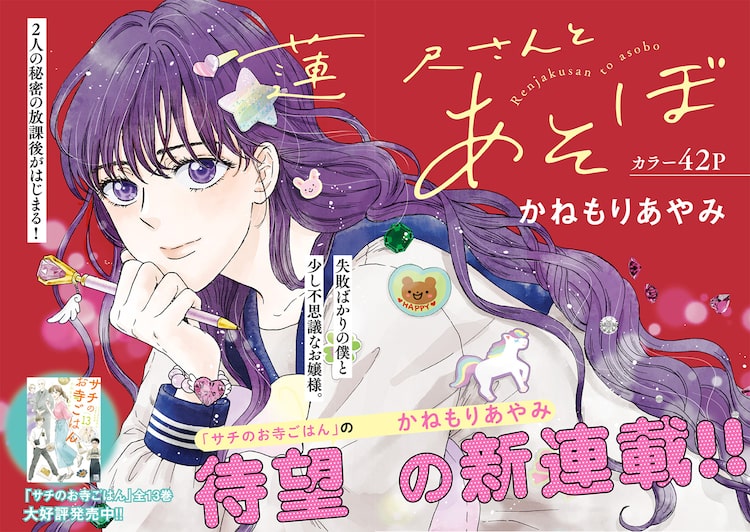 「サチのお寺ごはん」のかねもりによる新作「蓮尺さんとあそぼ」は、高身長でイケメンだけどどこか頼りない高校1年生の境純平が主人公。骨折してバスケ部を退部したばかりの純平は、ひょんなことから天然なお嬢様・蓮尺紫と出会い……。