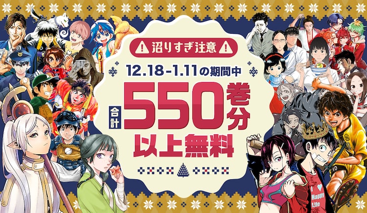 今回のキャンペーンでは、アニメが放送中の「葬送のフリーレン」「薬屋のひとりごと~猫猫の後宮謎解き手帳~」や、今後メディア化を予定している作品を対象に無料公開施策を展開。本日12月20日から31日までの期間は、「MIX」「死神坊ちゃんと黒メイド」「スプリガン」「ゾン100~ゾンビになるまでにしたい100のこと~」「BLUE GIANT」「トリリオンゲーム」「教場」の7作品が22巻分公開される。また1月1日から10日までは「葬送のフリーレン」「薬屋のひとりごと~猫猫の後宮謎解き手帳~」「ノケモノたちの夜」「異世界ワンターンキル姉さん ~姉同伴の異世界生活はじめました~」「君は放課後インソムニア」「トニカクカワイイ」の6作品が24巻分無料で配信。1月11日から20日までは「お別れホスピタル」「うる星やつら」「異世界失格」「疑似ハーレム」「結婚するって、本当ですか」「チ。―地球の運動について―」「今際の国のアリス」「夏目アラタの結婚」の8作品が、25巻分無料となる。