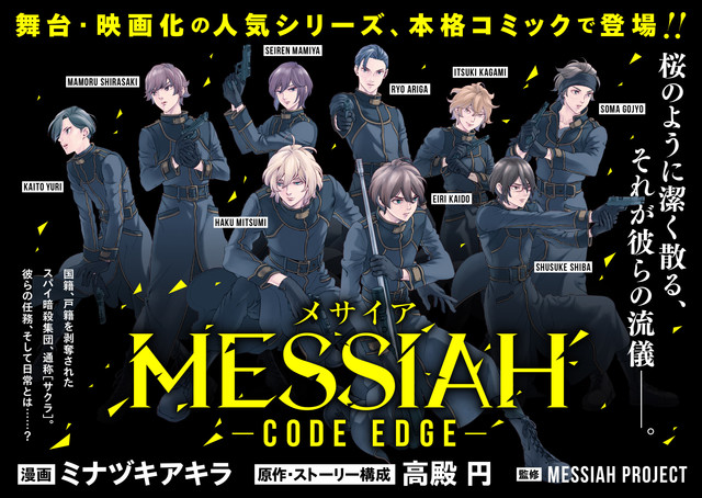 本作は高殿円の小説「メサイア 警備局特別公安五係」を原作に2010年より始動したメサイア・プロジェクトのコミカライズ作品。メサイア・プロジェクトでは、これまでにドラマCDや映画、舞台などで展開され、過酷な戦いに身を置く男たちの絆が描かれてきた。「MESSIAH -CODE EDGE-」では、世界規模の軍縮協定により、兵器による戦争がなくなり情報戦が激化した世界を舞台に、国家最高機密のスパイ組織、通称「サクラ」に属する男たちの任務や日常が描かれる。なお2話以降は、2018年1月より毎月第3水曜日に更新される。