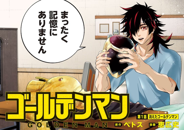 「亜人ちゃんは語りたい」のペトスが原作、「BLOODY MONDAY」の恵が作画を務める同作は、記憶をなくした最強のヒーロー・ゴールデンマンを描くヒーローエンタテインメント。日夜ヴィランに狙われるネオヨークでは、最強のヒーロー・ゴールデンマンが街を守っていた。しかしある夜、廃工場の火災で救助活動をしていたゴールデンマンが姿を消してしまう。代わりに現場にいたのは、ゴールデンマンスーツを手にした記憶喪失の青年。謎の力を持つその青年は、ゴールデンマンのフリをしてヴィランと戦うことになるが……。初回は巻頭カラー78ページで掲載された。