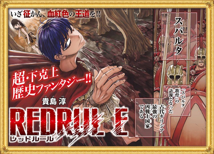 「RED RULE」は、古代ギリシャ・スパルタを舞台に、奴隷階級の少年・イアソンを描く英雄譚。農奴・商奴と呼ばれる奴隷階級に生まれたイアソンは、スパルタ市民に支配された生活を送っている。奴隷反乱の首謀者として公開処刑された亡き父の悲願を叶えようと、イアソンは反乱を起こすべく修行に励んでいた。そんなある日、妹のヘレネがスパルタ市民に襲われて……。