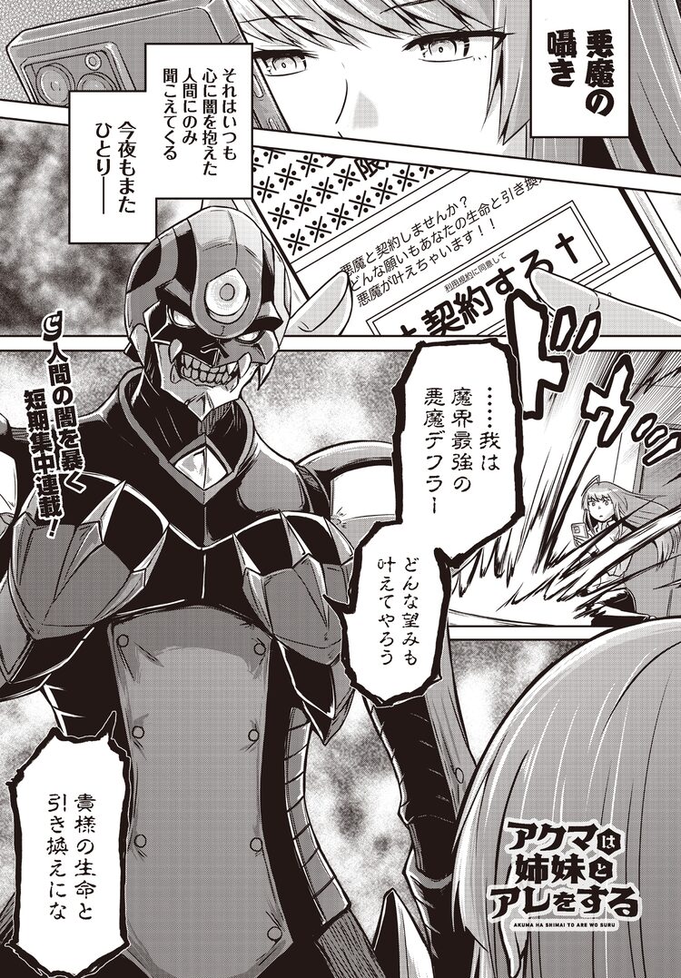 「アクマは姉妹とアレをする」は、魔界最強の悪魔・デフラーが、両親を亡くし1人で妹の世話をしながら働いている女性・王覇者城しずかに喚び出されたことから開始。命と引き換えに願いを叶えてやるというデフラーにしずかは「妹が立派な大人になるまで家事をして」とお願いする。
