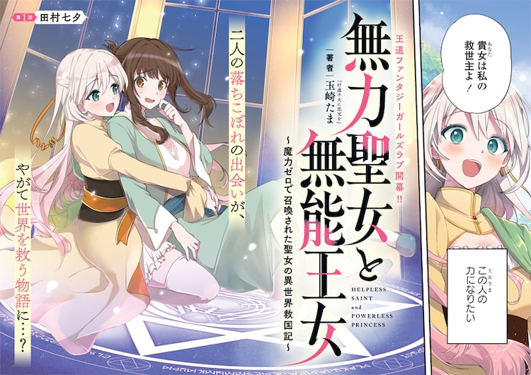 「無力聖女と無能王女~魔力ゼロで召喚された聖女の異世界救国記~」は異世界に召喚された田村七夕の冒険を描くファンタジーガールズラブ。七夕は見知らぬ世界で聖女として、王女と厄災を退けなければならないことを告げられる。しかし七夕には魔力がないことが発覚。そんな七夕を膨大な魔力を持ちつつも魔法が使えない王女・ルリアムが庇い、パートナーにするところから物語が展開される。
