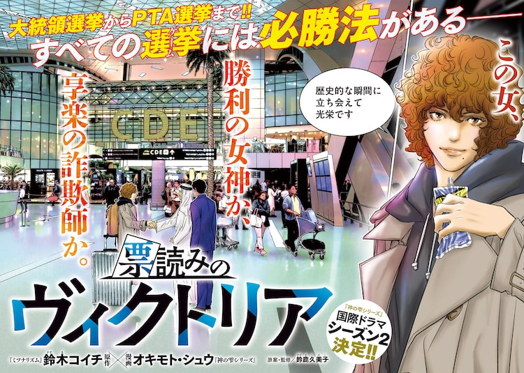 「票読みのヴィクトリア」は、金さえ積めばどんな候補者でも絶対に選挙に勝たせると噂の選挙コンサルタント・赤城翼を描く“選挙エンターテインメント”。政治家を目指し市長選へ立候補することを決めた青年・白根健造は、ある日、謎の女性・赤城と出会う。自身を「選挙マニア」だと語る赤城からのアドバイスを素直に受け入れ、選挙の開票に向けて着々と準備を進める健造だったが……。初回は巻頭カラーで掲載された。