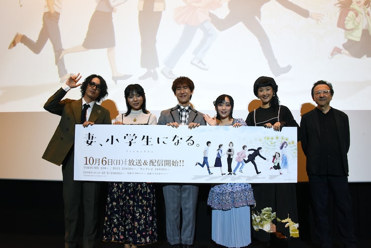 10月6日より放送される「妻、小学生になる。」は、事故で妻を亡くした愛妻家の圭介とその娘・麻衣のもとに、妻・貴恵が10歳の小学生の姿になって現れたことから始まる、家族の再生の物語。舞台挨拶付き上映会には、新島圭介役の平川大輔、新島貴恵・白石万理華役の悠木碧、新島麻衣役の野村麻衣子、白石千嘉役の小島幸子、愛川蓮司役の岩中睦樹、監督の阿部記之が登壇した。
