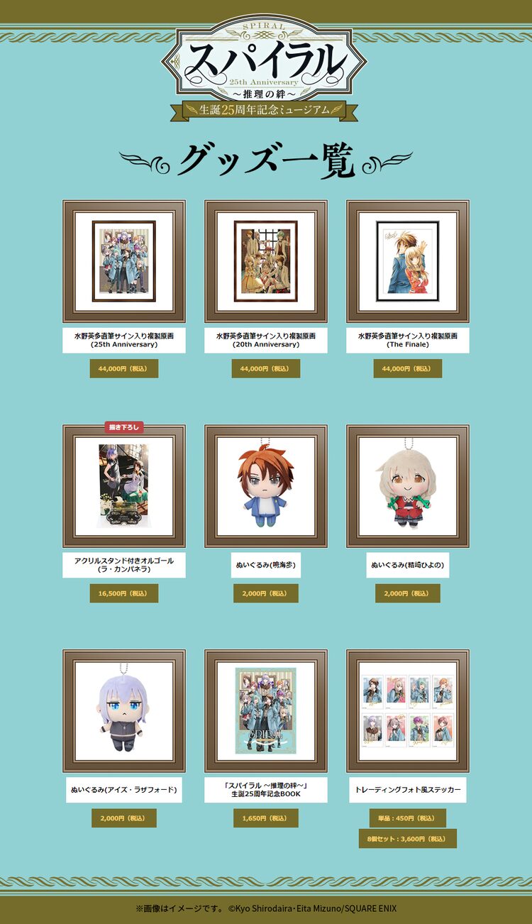 「スパイラル ~推理の絆~ 生誕25周年記念ミュージアム」は城平京原作、水野英多作画による「スパイラル ~推理の絆~」の作品誕生25周年を記念したイベント。グッズは水野による直筆サイン入り複製原画や「ラ・カンパネラ」を聞けるアクリルスタンド付きオルゴール、鳴海歩、結崎ひよの、アイズ・ラザフォードのぬいぐるみなどがラインナップされた。オルゴールのアクリルスタンドは水野の描き下ろし。そのほかのグッズは本記事の画像ギャラリーや公式サイトを確認しよう。