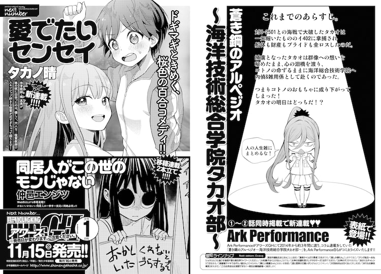 11月15日発売のアワーズGH2025年1月号(少年画報社)で、Ark Performanceによる新連載「蒼き鋼のアルペジオ~海洋技術総合学院タカオ部~」が始動する。本日10月16日発売のアワーズGH12月号で予告された。