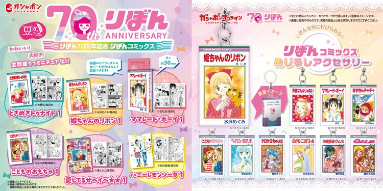 りぼん(集英社)が2025年に70周年を迎えることを記念して、カプセルトイ2種が2025年1月より全国のガシャポンバンダイオフィシャルショップ、玩具売り場、量販店、家電店などに設置されたガシャポン自販機シリーズで順次販売される。