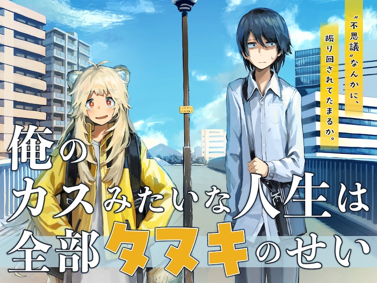 「俺のカスみたいな人生は全部タヌキのせい」の主人公・小野山新(アラタ)は、大学受験に失敗し2浪が決定した男子。模試では都内トップの成績なのになぜか本番になるとミスばかりしてしまう。そんなことが起きるのは自分の努力が足りないからだと思い込もうとするが、思い出されるのは、大学受験について占い師の父親から忠告された「落ちてもクヨクヨするなよ?」「アラタはそういう運命には居ないからさ」という言葉。運命だとか不思議だとか、科学的に説明できないものをアラタは信じない。そんな彼が、タヌキの耳と尻尾が生えた不思議な少女に出会ったことから物語は動き出す。
