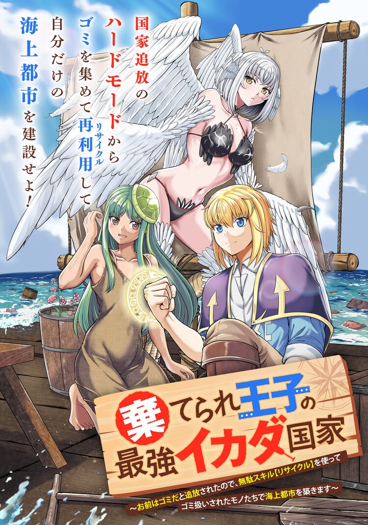 「棄てられ王子の最強イカダ国家 ~お前はゴミだと追放されたので、無駄スキル【リサイクル】を使ってゴミ扱いされたモノたちで海上都市を築きます~」は、タックの小説を原作としたコミカライズ作品。ゴミにしか効力が及ばない正体不明の不気味なスキル「リサイクル」を所持していることで忌み嫌われた王国の第一王子ノアクルは、勘違いから大罪人として追放されてしまう。イカダに乗せられ、ゴミだらけの海を領土として渡されたノアクルが「リサイクル」を使って生き延びる姿を描く。