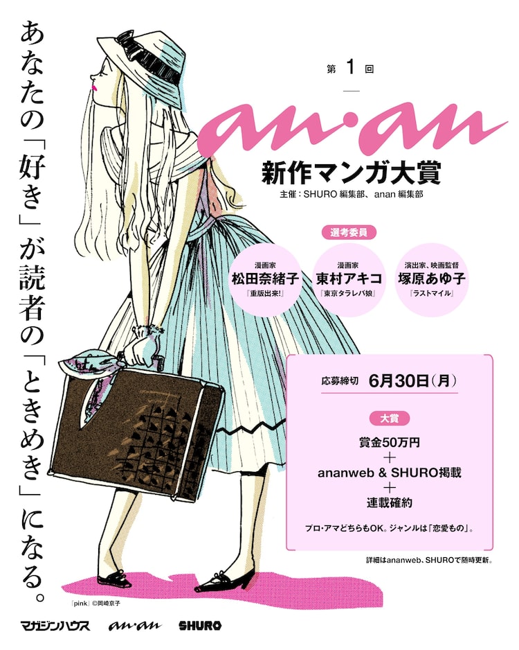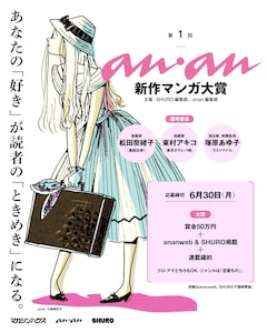 マガジンハウスの雑誌・ananと、Webマンガサイト・SHUROが共催する「anan新作マンガ大賞」。松田と東村は、ananで年に1度開催される「ananマンガ大賞」の受賞歴もある。「anan新作マンガ大賞」の第1回は「恋愛もの」がテーマ。「ananマンガ大賞」と同じく、「ラブストーリーである」「かっこいい、素敵な恋の相手、あるいは主人公が出てくる」「読んだ後に前向きな気持ちになれる」を選考基準に受賞作品が決定される。プロ・アマ問わず応募可能で、締切は6月30日。大賞作品には賞金50万円が進呈されるほか、anan webとSHUROでの掲載・連載が確約される。