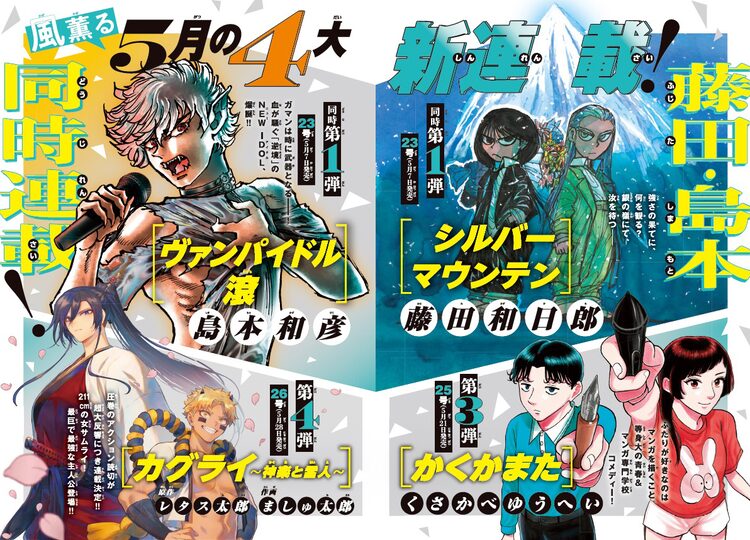 また5月21日に発売の25号では「白山と三田さん」のくさかべゆうへいによる新連載「かくかまた」、5月28日発売の26号ではレタス太郎原作、ましゅ太郎作画による「カグライ~神楽と雷人~」が開幕することも発表された。5月に始動する新連載4作品を、読者は楽しみにしておこう。