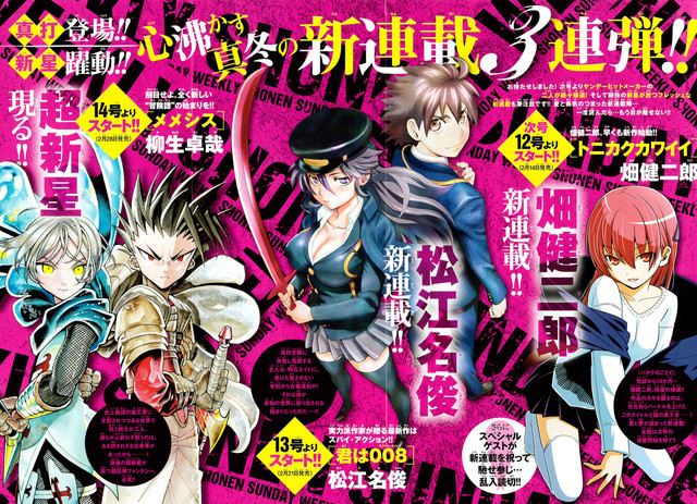 今冬新連載が始まることが告知されていた畑と松江名。畑の新連載「トニカクカワイイ」は2月14日発売の次号12号にて開幕し、今号には「さらにスペシャルゲストが新連載を祝って馳せ参じ…乱入読切!!」と予告が記された。また松江名の新連載「君は008(ダブルオーエイト)」は2月21日発売の同誌13号にてスタート。加えて2月28日発売の同誌14号では、新鋭・柳生卓哉の新連載「メメシス」が始動することも明かされた。