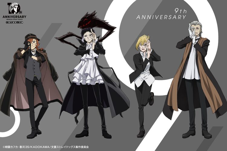 TVアニメ「文豪ストレイドッグス」の9周年を祝うビジュアルがお目見え。また来年迎える10周年に向け、7月から9月に実施する企画を発表した。