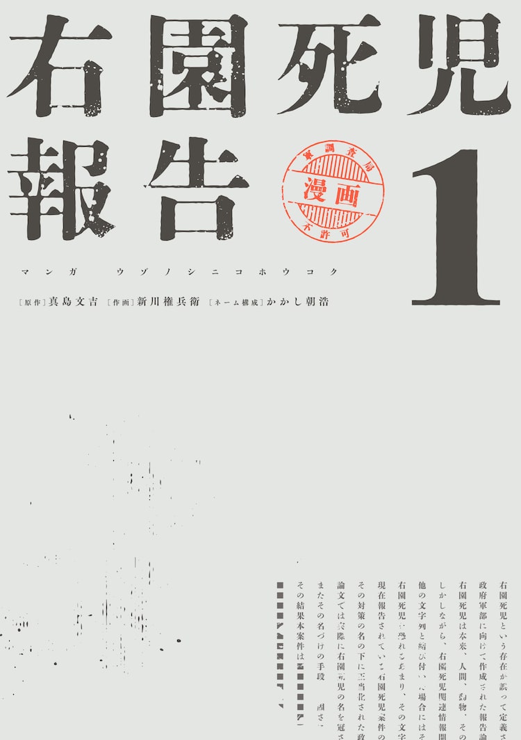 「右園死児報告」は、真島文吉の小説を原作としたコミカライズ作品。人間、動物、そのほか無機物などにその名称が付いたとき災害を誘引することから禁忌とされた文字列“右園死児(うぞのしにこ)”に関する調査報告という体裁で物語は進行する。何者かによって市内貯水池の名称が変更されてしまったことから起きた入水案件、山村で起きた「人間が人間に食害されている」という通報の顛末、それらの事件を引き起こした“右園死児”についてが描かれる。