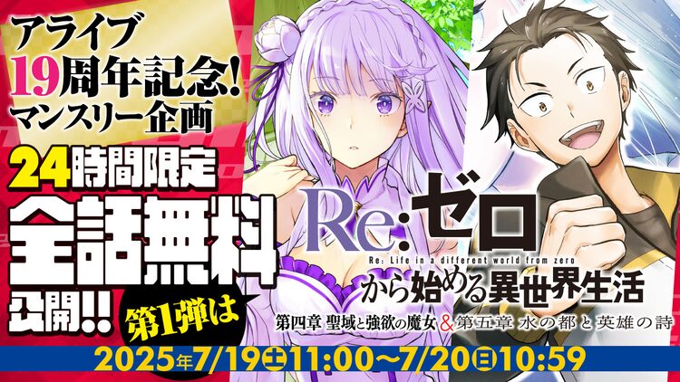「Re:ゼロから始める異世界生活 第四章 聖域と強欲の魔女」「Re:ゼロから始める異世界生活 第五章 水の都と英雄の詩」全話無料公開のバナー
