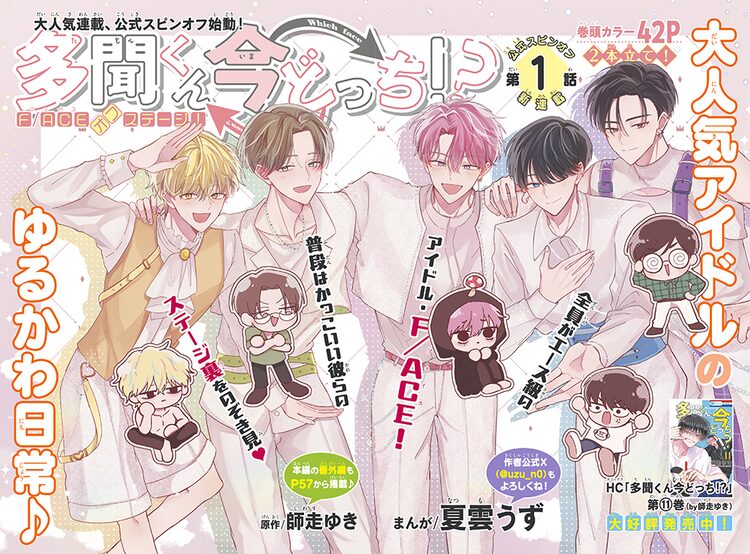 「多聞くん今どっち!? F/ACEオフステージ!」は全員がエース級のアイドルグループ・F/ACEの日常を描くスピンオフ。初回は一挙2話が掲載され、第1話では多忙なF/ACEが1週間の有給をかけた“SNSいいねバトル”を行う。