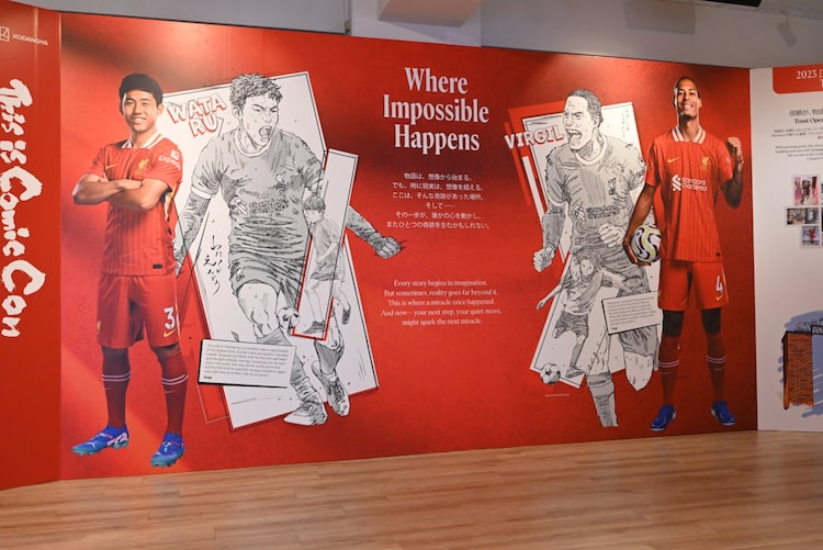 そんな会場内を埋め尽くす展示物の中には、安田の「DAYS」や金城宗幸原作によるノ村優介「ブルーロック」と、リバプールFCのコラボイラストも多い。「GIANT KILLING」を手がけるツジトモが、リバプールFCの選手や元監督で絶大な人気を誇ったユルゲン・クロップ氏を描いたイラストを含めて、コラボイラストが集結している。また、リバプールFC史上初のアジア人選手として歴史に名を刻んだ南野拓実選手、現在リバプールFCに所属し日本代表ではキャプテンを務める遠藤航選手、リバプールFCウィメンで活躍する長野風花選手を描いたイラストやマンガも展示されている。