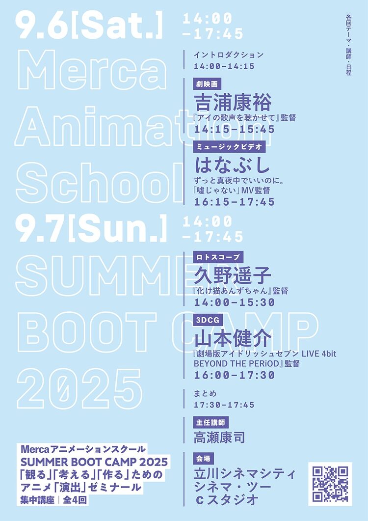 アニメーション制作についての夏期集中講座「Mercaアニメーションスクール SUMMER BOOT CAMP 2025──『観る』『考える』『作る』ためのアニメ『演出』ゼミナール」が、9月6日と7日に東京・立川シネマシティのシネマ・ツーで開催される。
