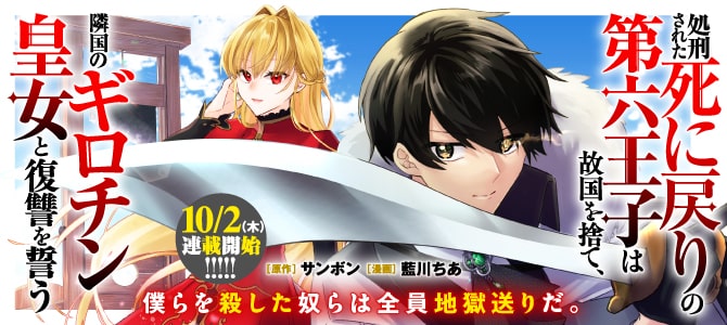 サンボン原作による藍川ちあの新連載「処刑された死に戻りの第六王子は故国を捨て、隣国のギロチン皇女と復讐を誓う」が、本日10月2日にアルファポリスでスタートした。
