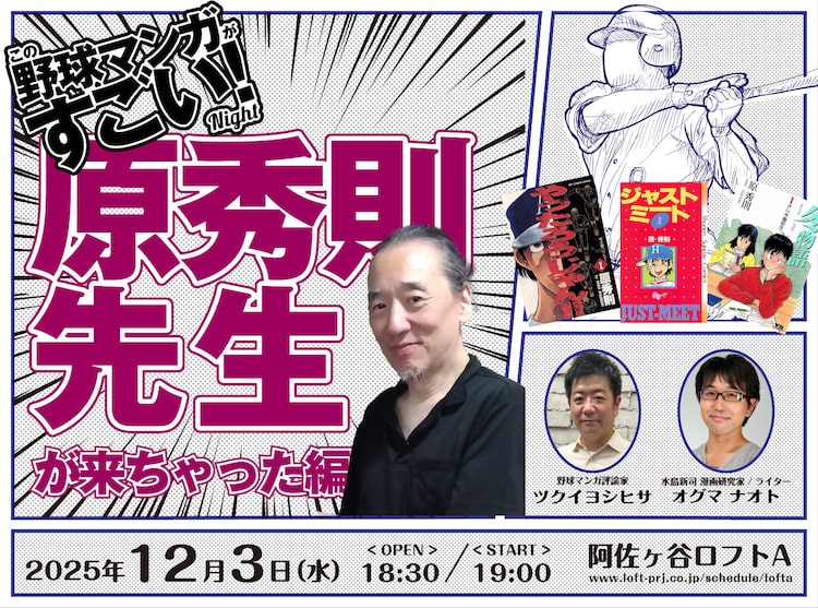 原が参加するのは、12月3日に阿佐ヶ谷ロフトAで開催される回。今回のように直接ファンの前に姿を見せるのは、原本人によると30年ほど前のサイン会以来になる。またトークショーに登壇するのは「たぶん初めて」だという。イベントでは野球マンガだけでなく、「冬物語」「部屋においでよ」「SOMEDAY」など、恋愛マンガについてのトークも予定。さらに来場者限定の直筆サイン色紙争奪戦も実施される。なお、原のほかには野球マンガ評論家のツクイヨシヒサ、水島新司マンガ研究家のオグマナオトが出演する。LivePocket -Ticket-で前売チケット、ツイキャスで配信チケットが販売中だ。