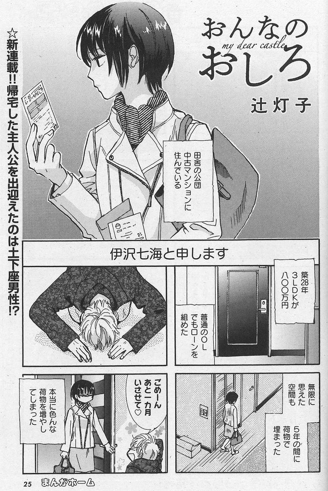 「おんなのおしろ」は、ローンで購入した田舎の公団中古マンションに住むOL・伊沢七海を描く4コマ作品。広かった家も住み始めて5年が経つと持ち物で埋まり、そんな彼女のもとに別れた男という新しい荷物がやって来る。1カ月だけという約束で居候を認めた七海だが、その彼が彼女の予想もしなかった荷物を持っていたことから物語は動き出す。