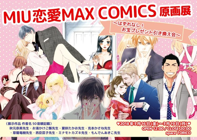 「MIU恋愛MAX COMICS原画展」では秋元奈美草薙竜樹もんでんあきこら8名の原画、複製原画を展示。参加作家の単行本を会場で購入すると、イベント限定のペーパーが特典として付属する。また明日3月17日には、15時から夏咲たかお、15時30分からはミナモトカズキのサイン会を実施。会場でそれぞれの単行本を購入することで参加できる。
