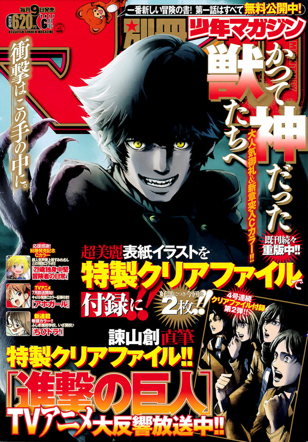また今号には付録として、諫山創「進撃の巨人」と、めいびい「かつて神だった獣たちへ」のクリアファイルが付属。それぞれ別マガの表紙イラストを使用したもので、「進撃の巨人」は前号の表紙、「かつて神だった獣たちへ」は、今月号の表紙となっている。