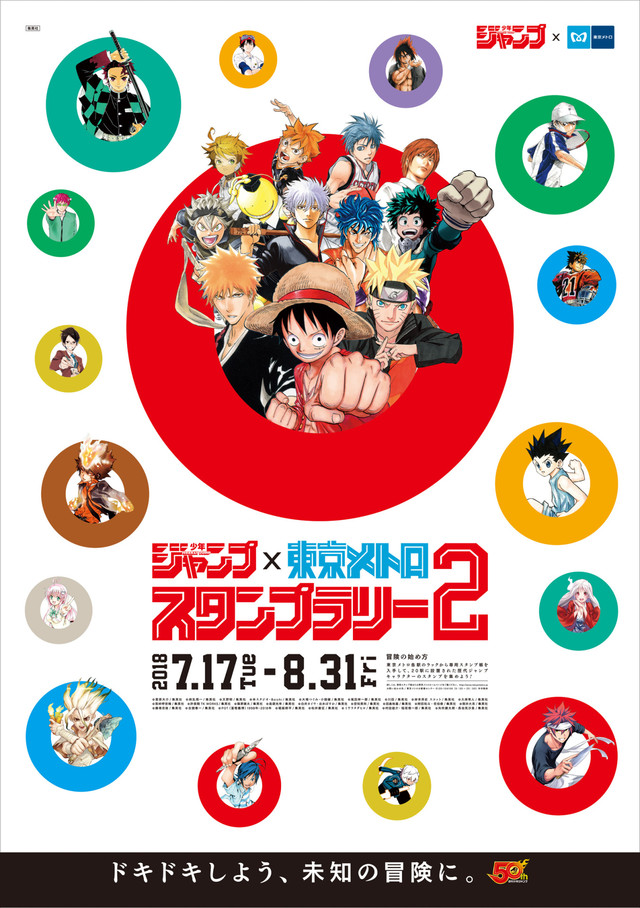 週刊少年ジャンプ(集英社)の50周年を記念した「創刊50周年記念 週刊少年ジャンプ展 VOL.3 2000年代~、進化する最強雑誌の現在(いま)」が、本日7月17日に開幕したことに合わせ、東京メトロにて同誌のキャラクターを使ったスタンプラリーが同じく本日スタートした。