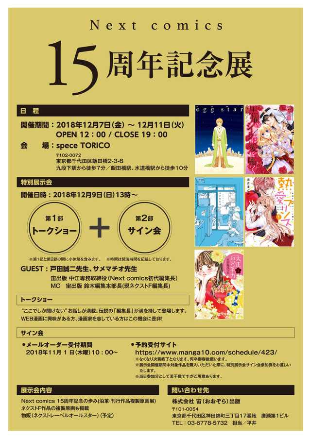 宙出版のマンガレーベル・Next comicsの15周年記念展が、12月7日から11日まで東京・space TORICOにて開催される。